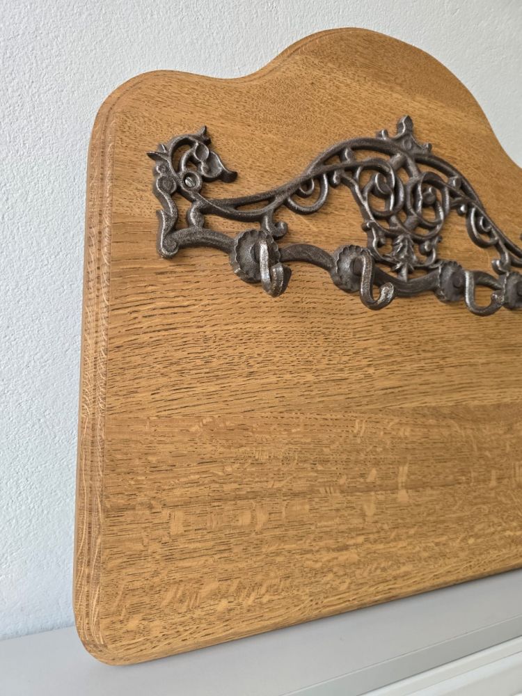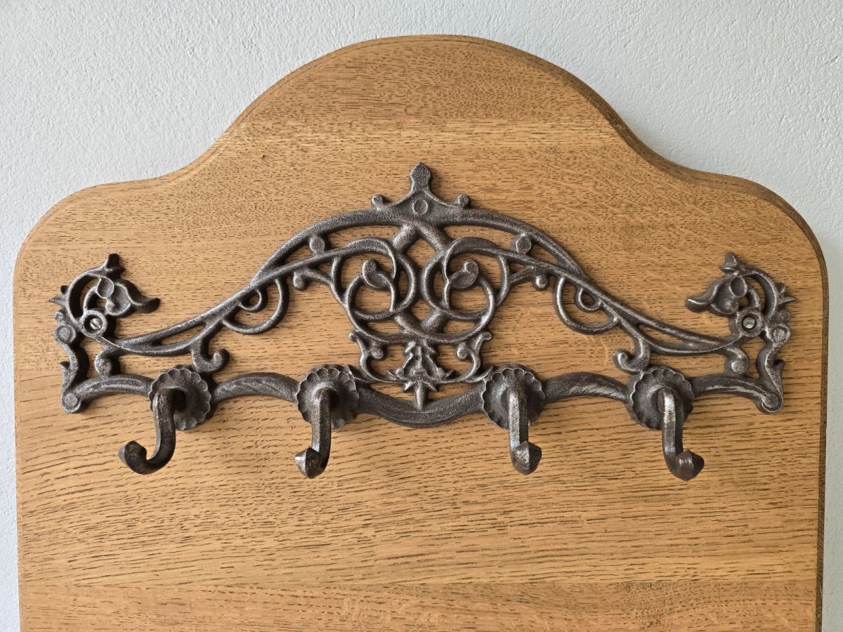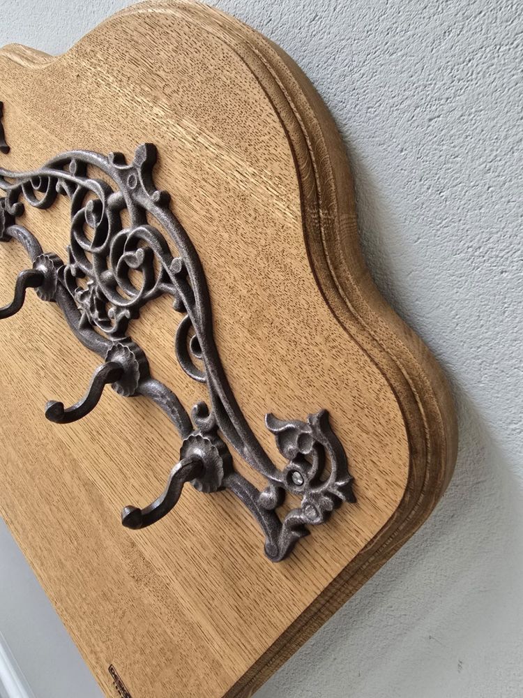 Całość uzupełnia żelazne okucie - haki wieszakowe, które nadają surowego, industrialnego stylu i gwarantują niezawodną wytrzymałość. Wieszak doskonale sprawdzi się w przedpokoju, korytarzu lub garderobie, stanowiąc zarówno funkcjonalny, jak i dekoracyjny element wnętrza.