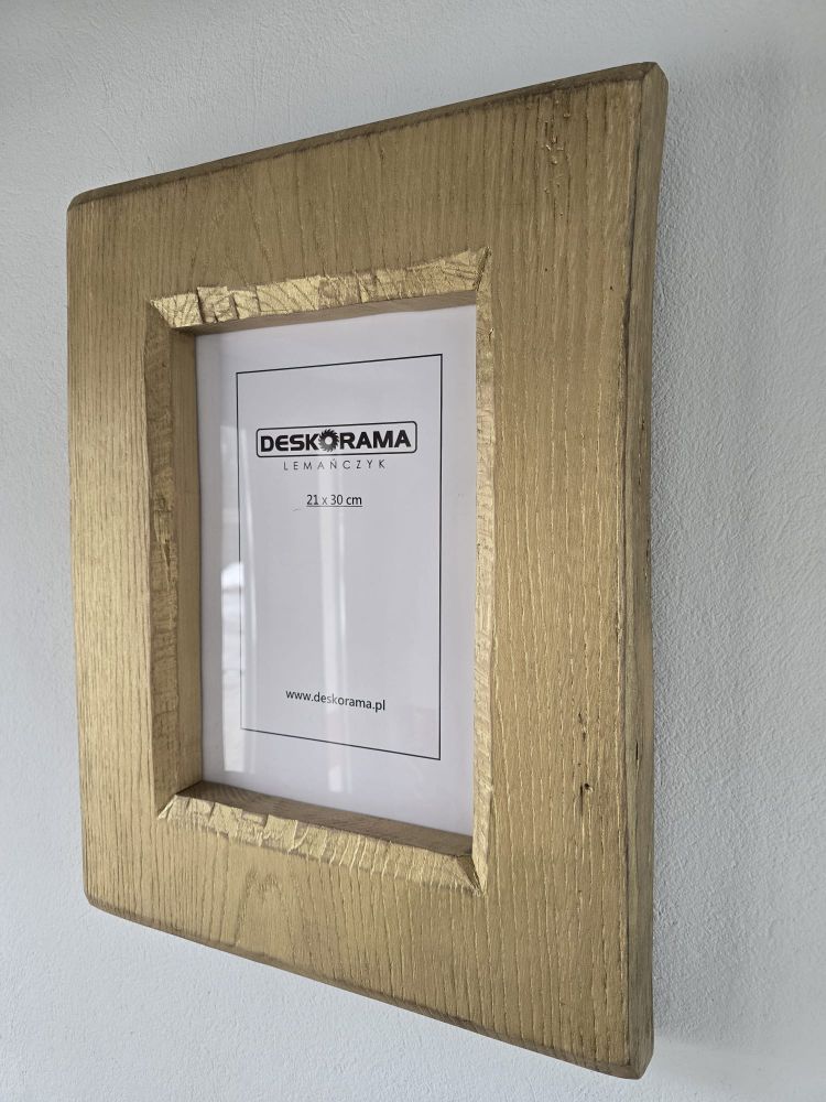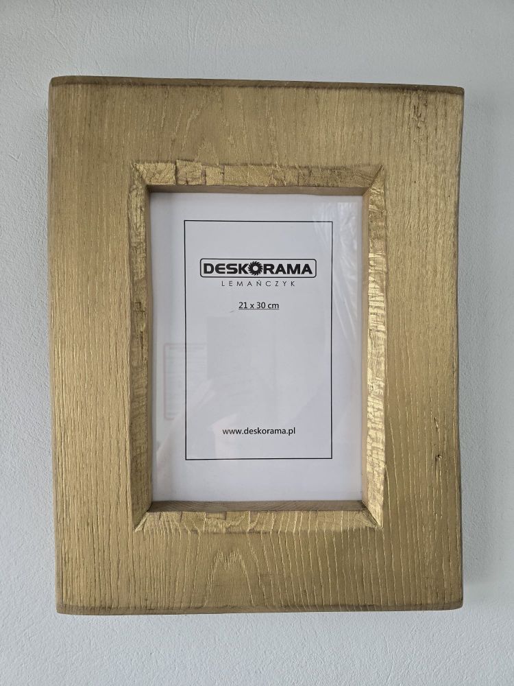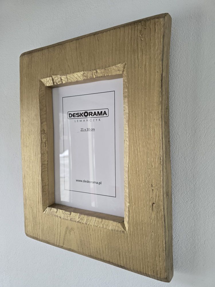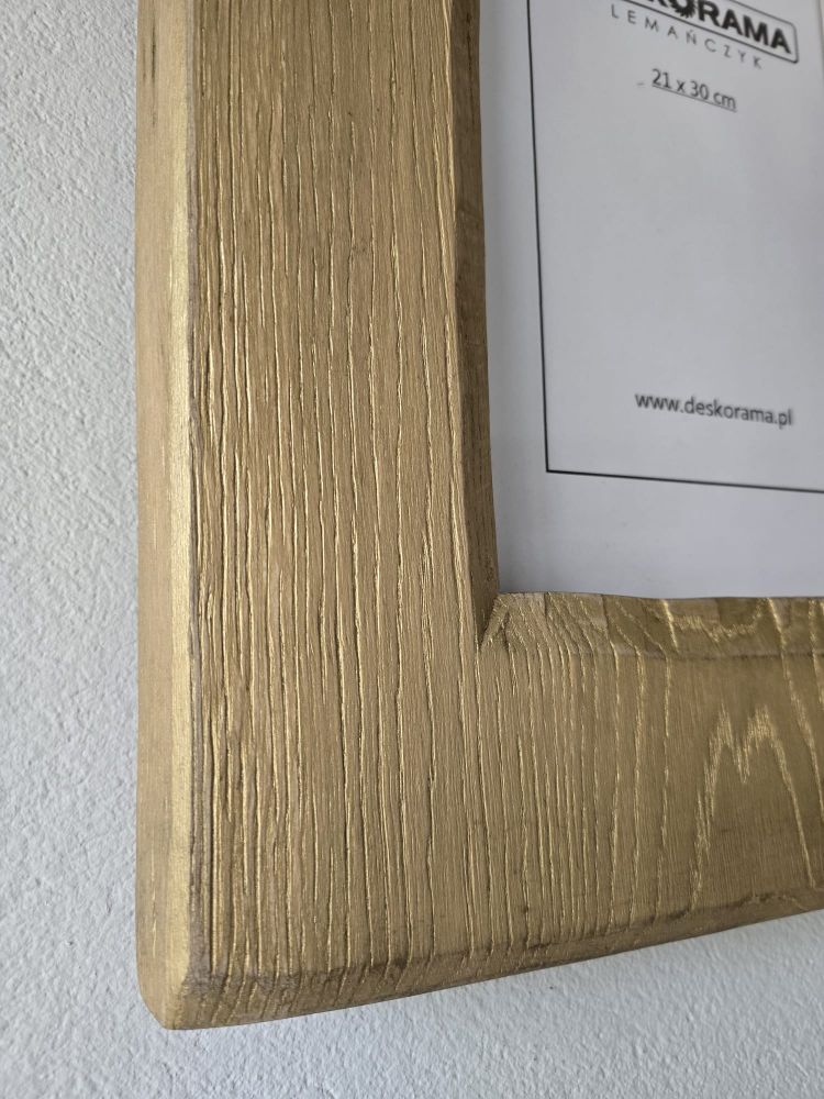 Wyjątkowa ramka stworzona z jednego kawałka drewna dębowego. Bez łączeń – solidna, trwała i dopracowana w każdym detalu. Naturalne usłojenie dębu pięknie prześwituje spod złotej farby, która została delikatnie przetarta, nadając całości szlachetny, lekko vintage’owy charakter.