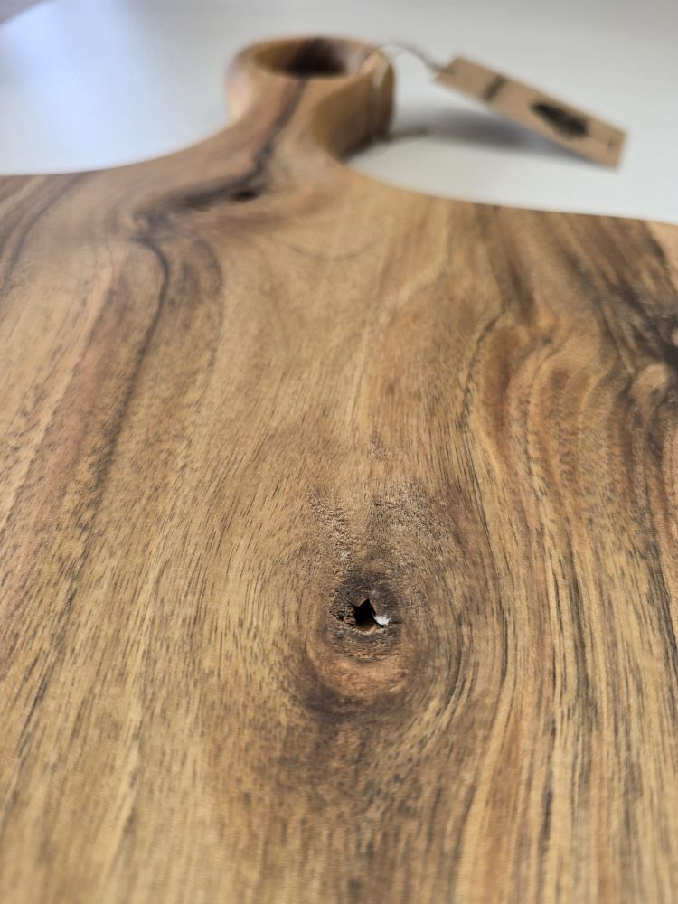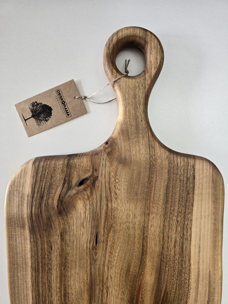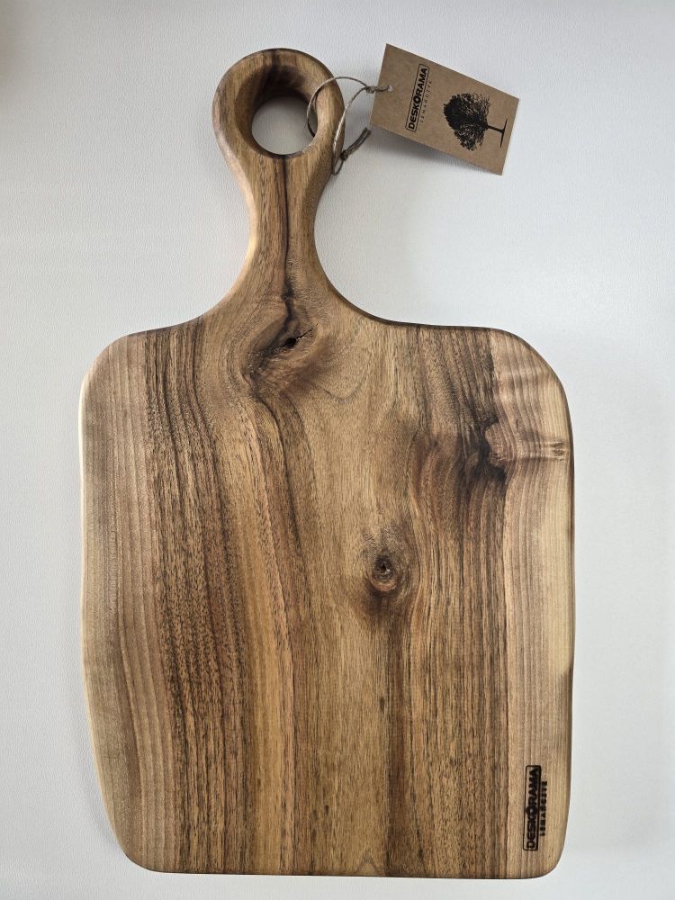 Elegancka i funkcjonalna deska wykonana ręcznie z jednego kawałka drewna orzecha włoskiego. Naturalny kolor drewna, unikalne usłojenie i gładko wykończona powierzchnia sprawiają, że każda deska jest niepowtarzalna i stanowi wyjątkowy element wyposażenia kuchni.