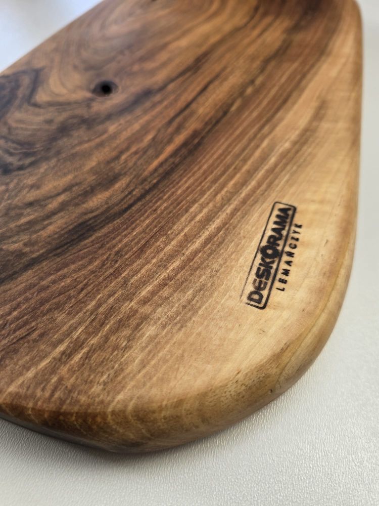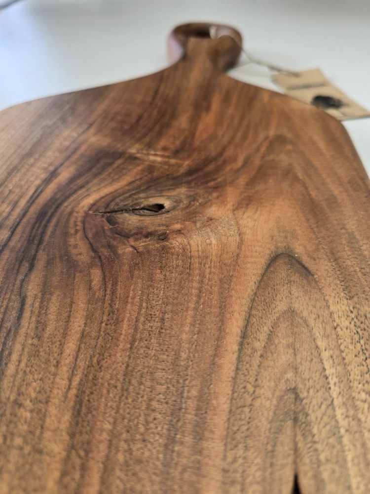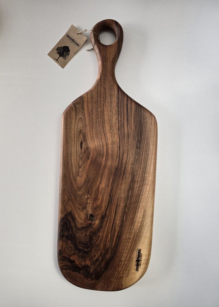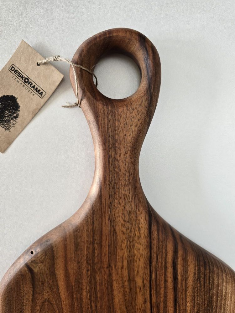 Elegancka i funkcjonalna deska wykonana ręcznie z jednego kawałka drewna orzecha włoskiego. Naturalny kolor drewna, unikalne usłojenie i gładko wykończona powierzchnia sprawiają, że każda deska jest niepowtarzalna i stanowi wyjątkowy element wyposażenia kuchni.